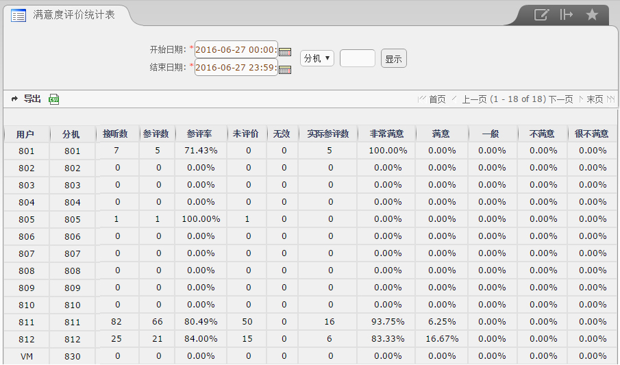 【说明】统计坐席的参评率及各项评价百分比分布,为坐席服务质量考核提供依据