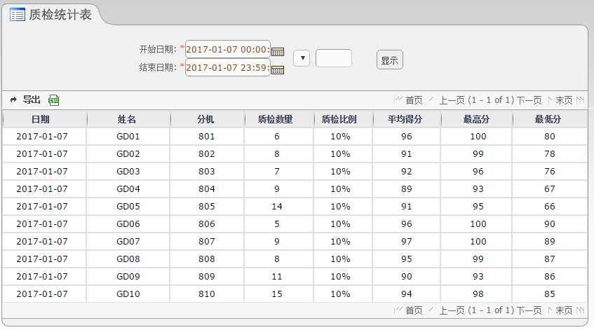 【说明】按批次生成质检报表,统计质检数量、比例、平均分、最高分、最低分等