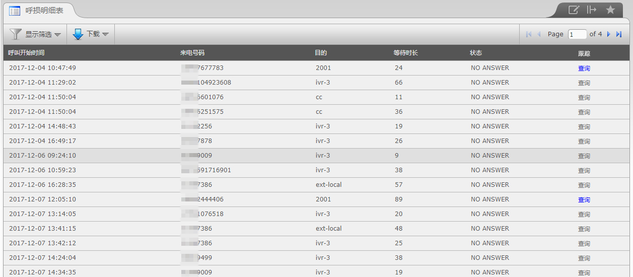 【说明】提供呼损电话明细,并可进行跟踪分析呼损产生的环节以及后续来电情况