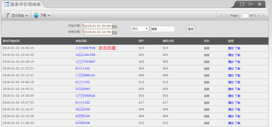 【说明】记录每一通来电的评价值,可按评价类型查看、播放录音以及回拨