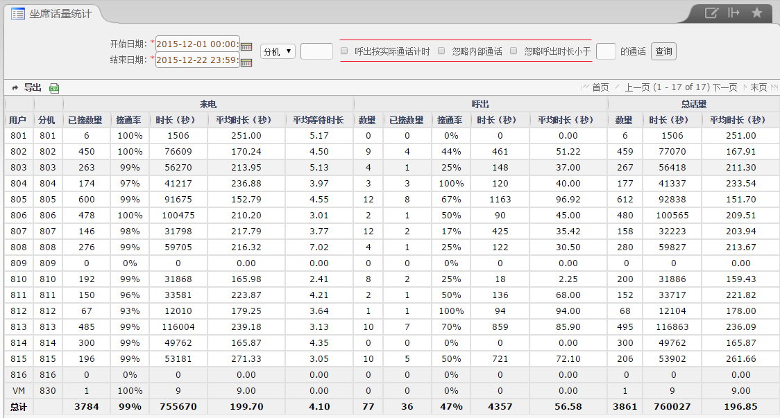 【说明】统计坐席接听及呼出电话数量、接通率、时长、平均时长等信息;呼出电话数量及时长可以过滤掉未接通的、内部通话以及短话。